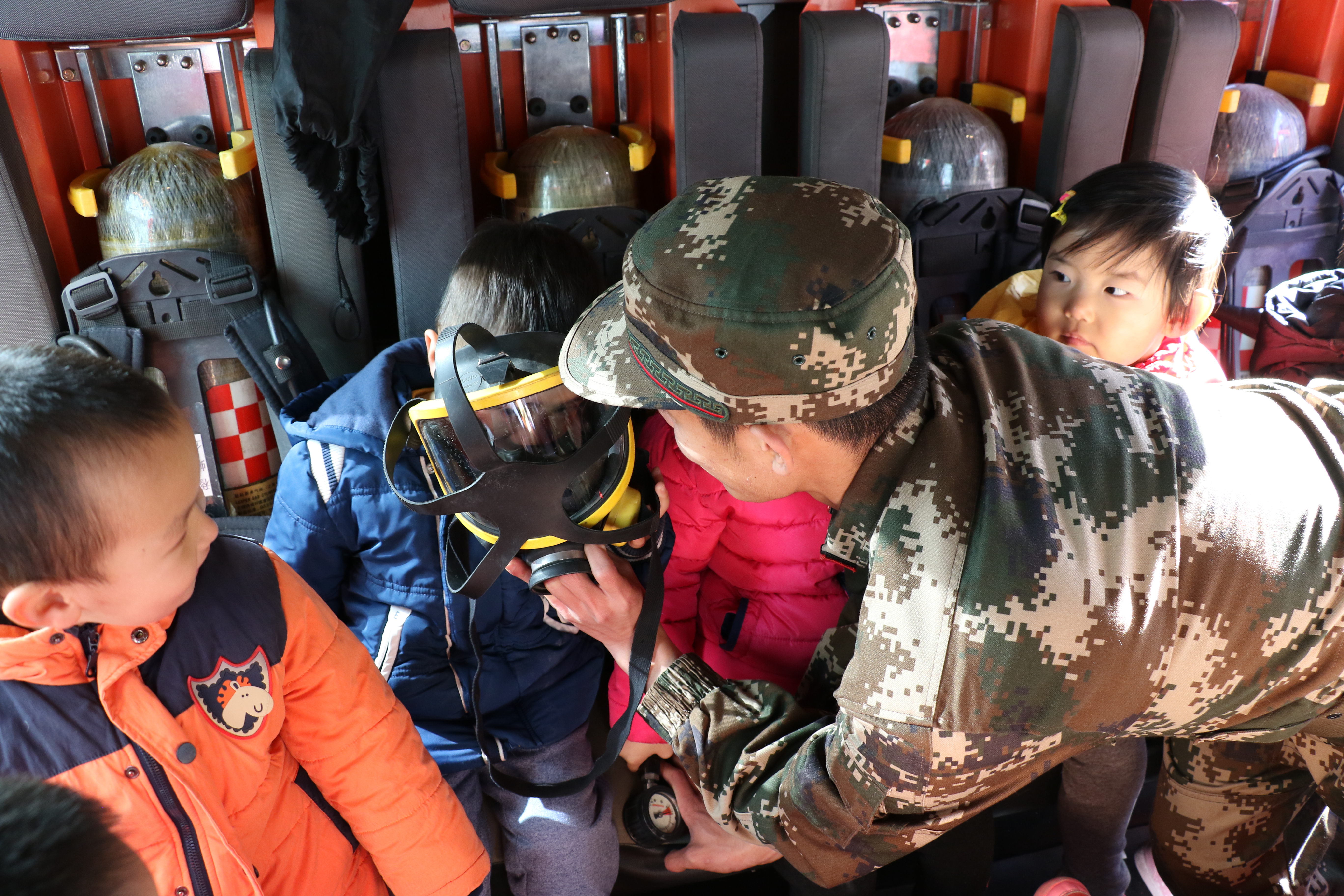 消防员叔叔讲解消防设备怎么用。