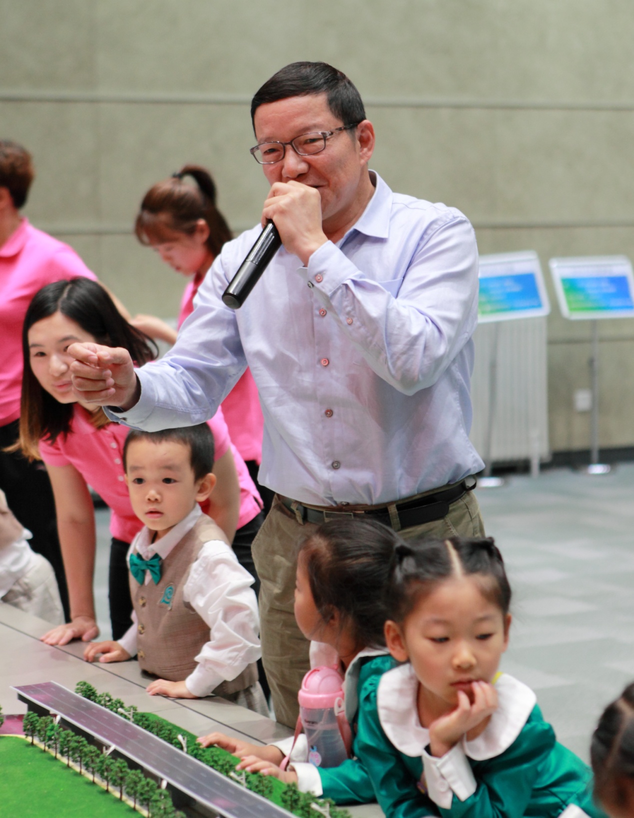 站在沙盘模型前,贺爷爷耐心地向小朋友介绍飞机从设计研发到试飞成功的每一个部门所在地。