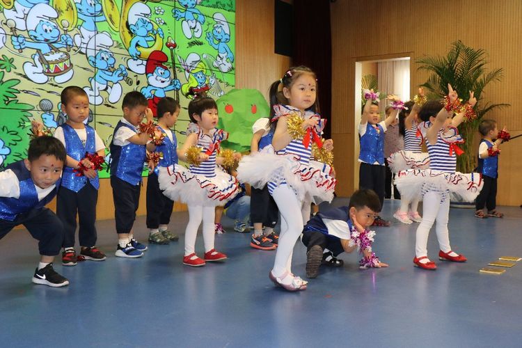 欢快舞蹈《蓝精灵》,小六班的表演者真像舞台中心悦动美丽的小精灵。