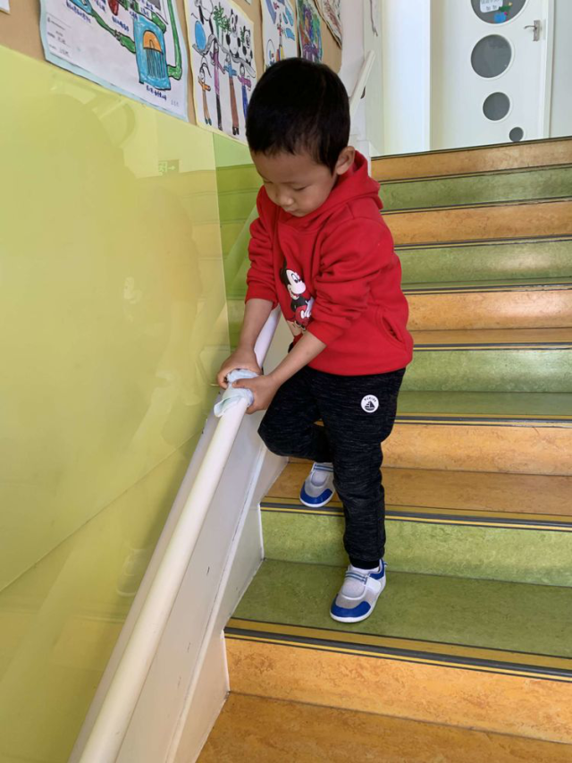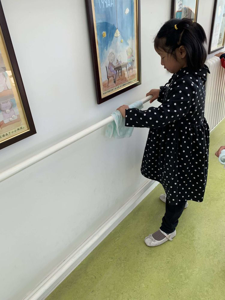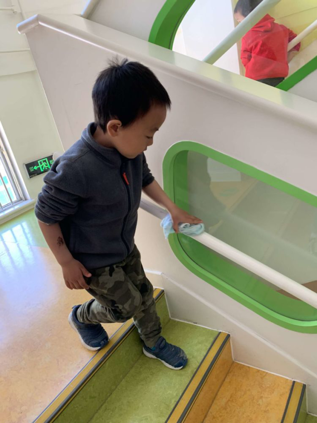 楼梯把手也是小朋友们每天要扶的地方,我也要将它擦干净!