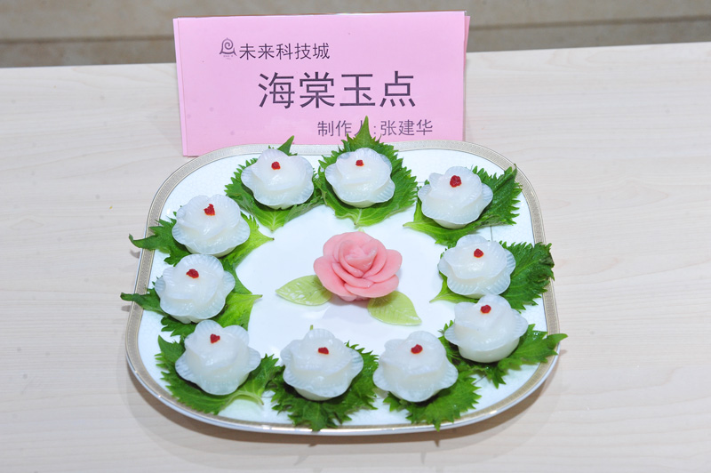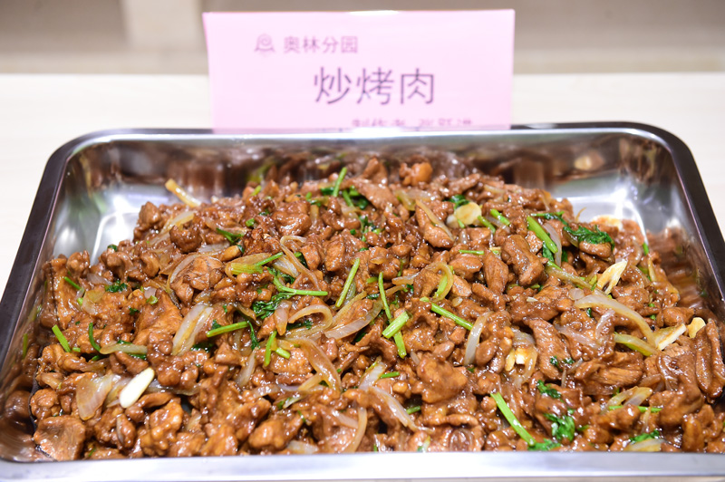 厨艺展演分成两个部分,一是花样菜品。七所幼儿园的厨师们纷纷展示自己的特色拿手菜,荤菜中,有烧烤羊肉、馋嘴牛柳、芙蓉虾球、橄榄鱼丸、糖醋排骨、松仁鱼米等等。