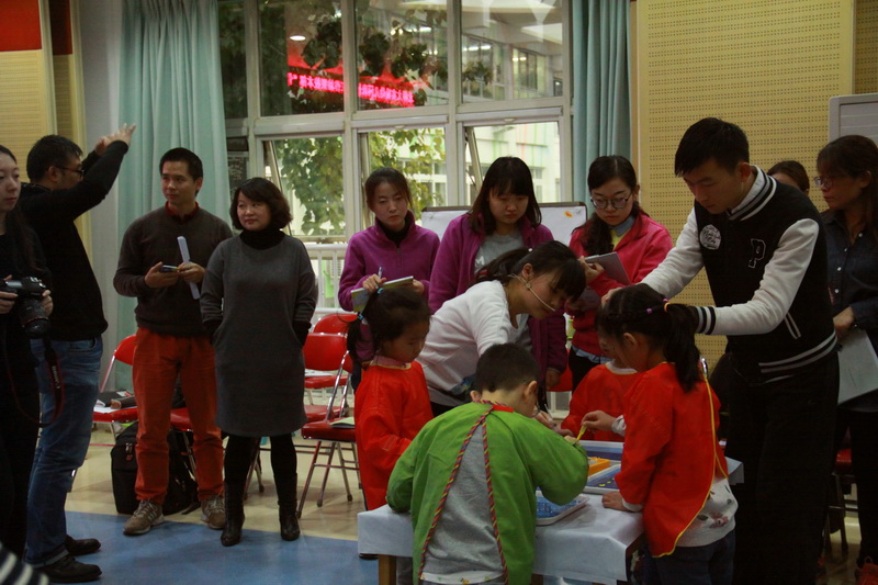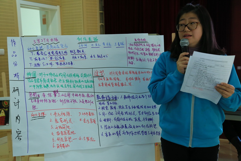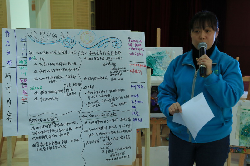 对幼儿学习行为准确的观察、记录和分析是本次研讨活动的重点。在活动过程中,观摩教师分组用录像、拍照的方式对活动过程进行了全程记录和输出整理,并在活动后对幼儿绘画过程的想法进行了访谈。在此全面观察的基础上,邱守老师就骨干教师的实践教学研究进行了综合评析,并引导教师们从“幼儿活动中的收获”、“教师如何体现指导作用”以及“如何评价幼儿作品”三个方面进行反思。观摩教师结合录像、访谈和孩子的作品进行了热烈讨论,并分组对以上问题进行了沟通交流。