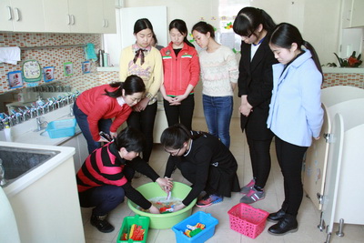保育是幼儿园保教工作的基础,是幼儿园提升教育质量的关键。2016年3月5日,正规滚球app官方网站培训部组织了保育员系列培训。培训坚持理论结合实践的原则,采用理论学习和实践操作相接合的培训方法,让老师们在学习中反思,在实际操作中学习,收到了很好的培训效果。