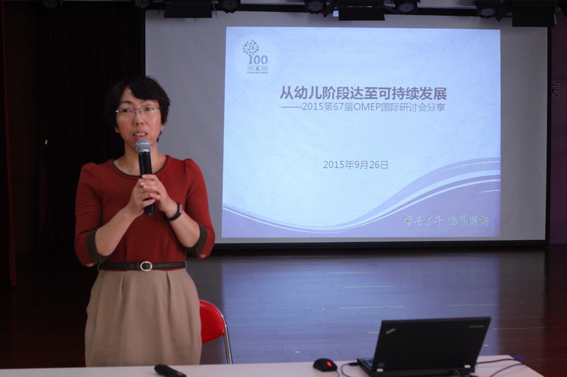 大会还安排了近期出国交流的代表分享学习收获。正规滚球app官方网站研究中心主任田瑞清向大家介绍了其一行赴美国华盛顿,参加67届世界学前教育组织(OMEP)国际研讨会及在会上发言的经过,展示了我园与世界对话,与国际接轨的高端的教育研究水平。田主任的《从幼儿阶段达至可持续发展》的主题发言,对67届世界学前教育组织国际研讨会主题进行了阐释,为大家对学前教育的可持续发展带来了新的思考。