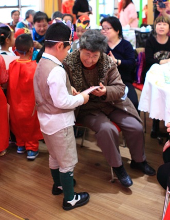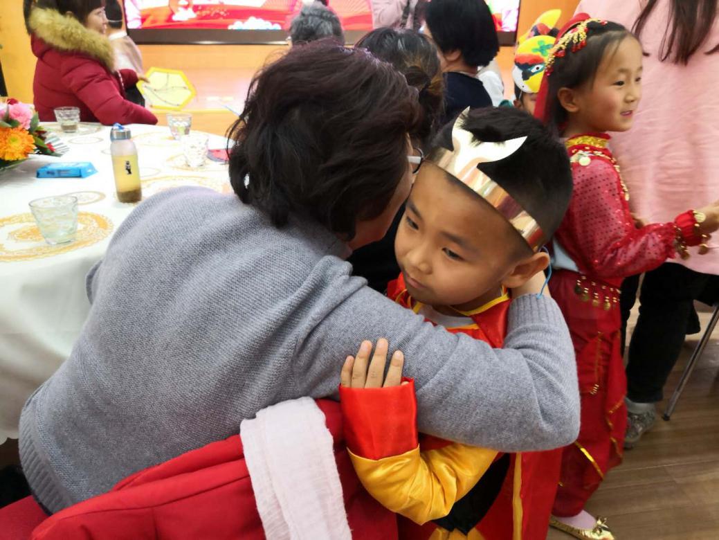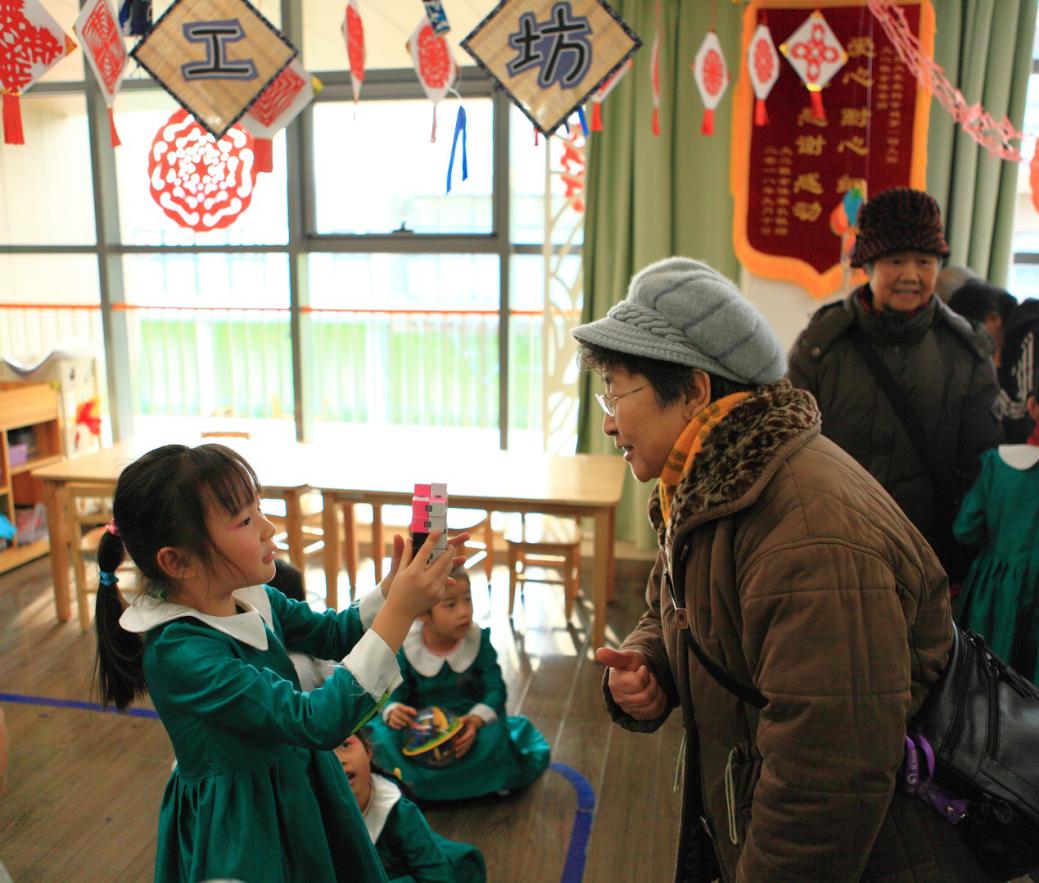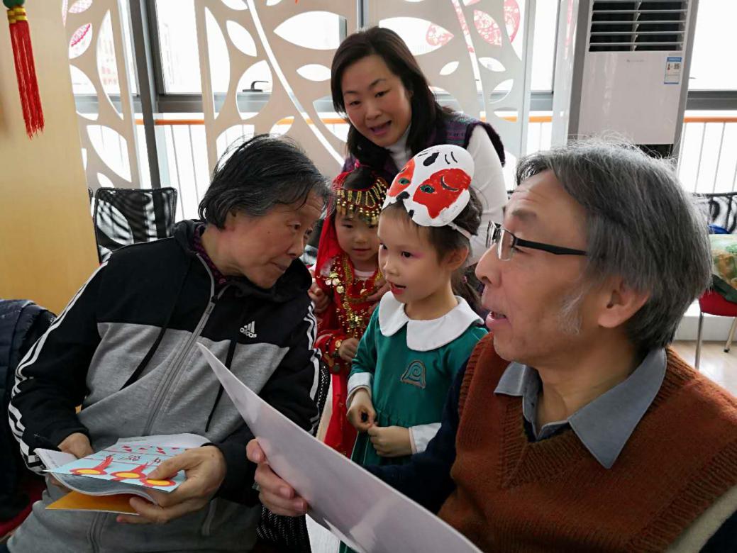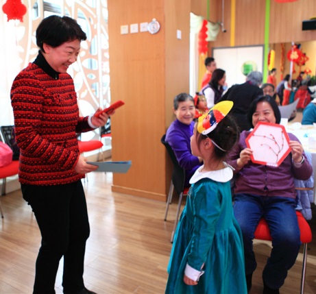 小朋友们将亲手制作的年画、脸谱送给奶奶老师,祝福她们福如东海,寿比南山,年年有余,岁岁平安。