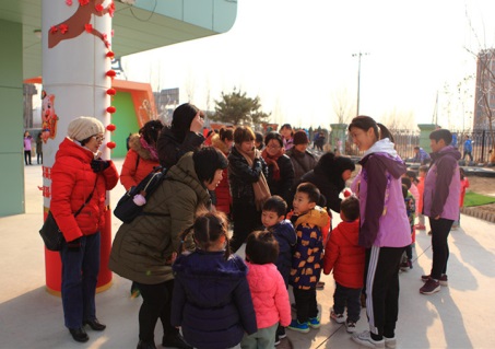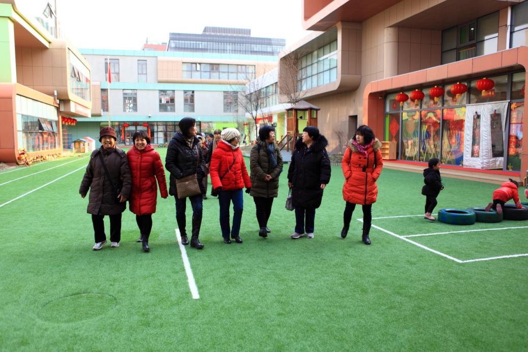 董园长引导老教师参观幼儿园的环境和图书馆,介绍了班级的活动。新年活动即将开始,园里一片喜气洋洋。