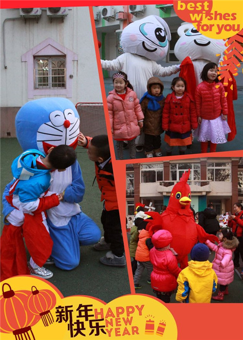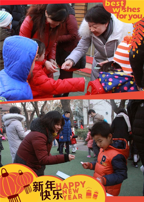 入园时间到了!园长老师和各种形象的人偶,在幼儿园门口迎接小朋友们,小朋友在得到老师们和喜庆的人偶送来祝福的同时,还领取到了一张张神秘的小卡片,这些小卡片可是作为新年自制礼物漂流活动的幸运号码哟!