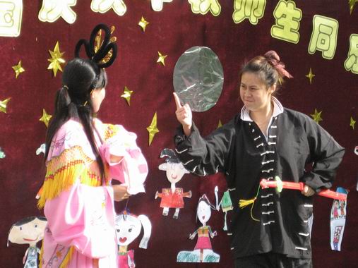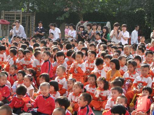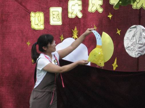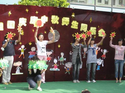 在同乐会上,老师和孩子们通过《国旗国旗多美丽》、《大中国》、《我爱北京天安门》、《国旗红红的哩》等歌舞,表达了对祖国的热爱之情,相信爱祖国、爱家园的种子已经深深扎根在他们的内心深处了。老师和孩子们还表演了《木偶剧:月亮婆婆做衣裳》、《弯弯的月儿、小小的船》、《小月亮》、《爷爷为我打月饼》、《月亮婆婆》等节目。日托组的老师们还特别演出了幼儿园的传统节目《嫦娥奔月》,为孩子们形象的讲述了中秋节的来历……在轻松、和谐的氛围中,让孩子们体验了节日的快乐,了解了中秋节的文化。
