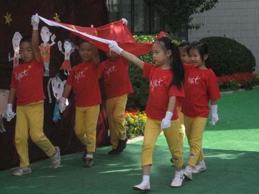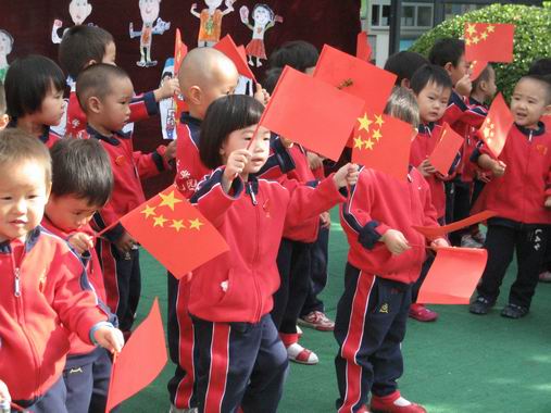 小班的小朋友们情不自禁地挥舞着手中的国旗,庆祝伟大祖国六十华诞。
