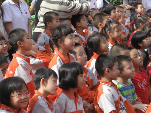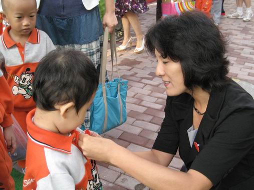 清晨,领导给孩子和老师们佩戴上一枚枚鲜艳的心型五星红旗。