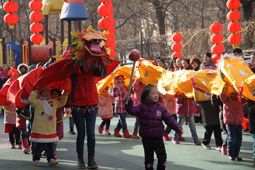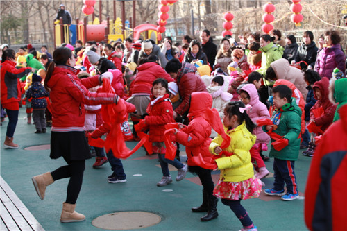 班级联欢会后,全园幼儿与家长分两场来到操场观看舞龙舞狮旱船表演。由全体大班幼儿带来的舞龙及滑旱船的表演获得了阵阵掌声,中小班幼儿及家长也挥舞起火红的绸带,在空中画出一道道喜庆的弧线。