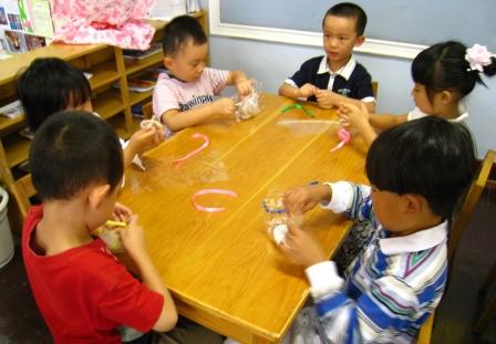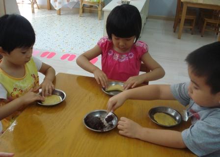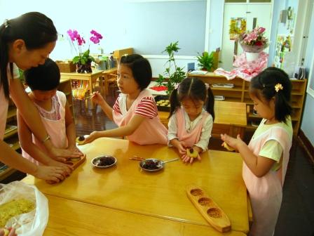 孩子们自己将面团压扁,在面团中包入豆沙馅
