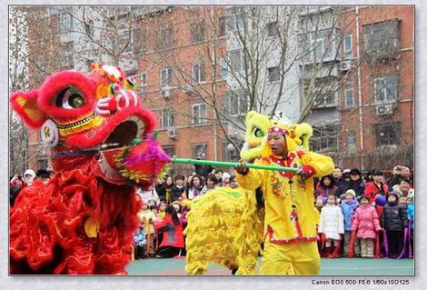 (三)舞龙舞狮庆新年 来不及细细品味新年联欢的喜庆味道,舞龙舞狮、腰鼓队、秧歌队、小丑出场了…… 1、舞龙舞狮 不少史书上记载:龙舞流行于我国很多地方。龙是吉祥的象征。每条龙还伴有十番锣鼓,声闻十里,甚为壮观。表演时腾飞欢跃,好似江海波翻浪涌,气势非凡雄伟。舞狮子,是我国优秀的民间艺术。狮子为百兽之尊,是勇敢和力量的象征,以护佑生活吉祥如意,事事平安。
