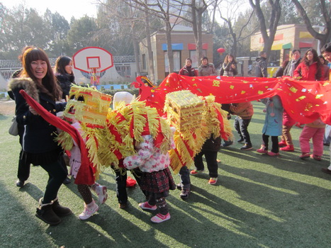 热心的爸爸们表演双龙戏珠