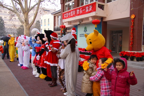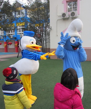一大早,来园的孩子和家长首先被院子里造型各异、活泼可爱的卡通人偶吸引住了,梦想中的童话角色点燃了孩子们的参与热情,在与之或合影留念或翩翩共舞的亲密接触中,快乐的一天开始了!