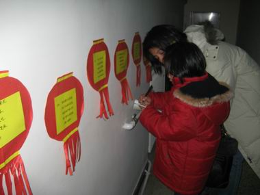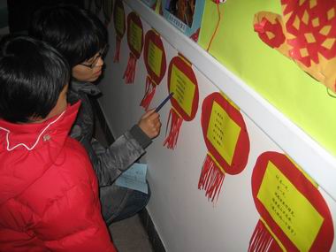 滚球app牡丹分园的公共环境中到处张贴了400余张灯谜,在新年将至的一周内,家长和孩子们利用来园和离园时间共同参加猜灯谜的活动。