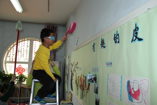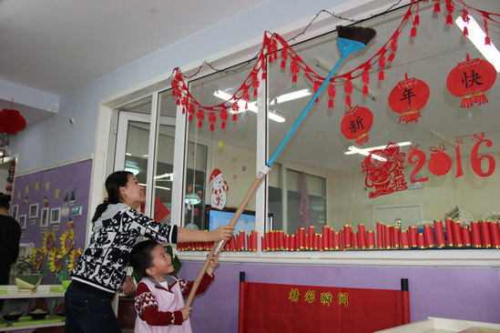 2015年12月23日,孩子们精心准备了各种打扫用具,在自己班上忙前忙后,把自己班级打扫的焕然一新,干干净净地迎新春。新年民俗“扫房子”的活动让幼儿既体验了劳动的快乐,也体验了迎新年的真实含义。