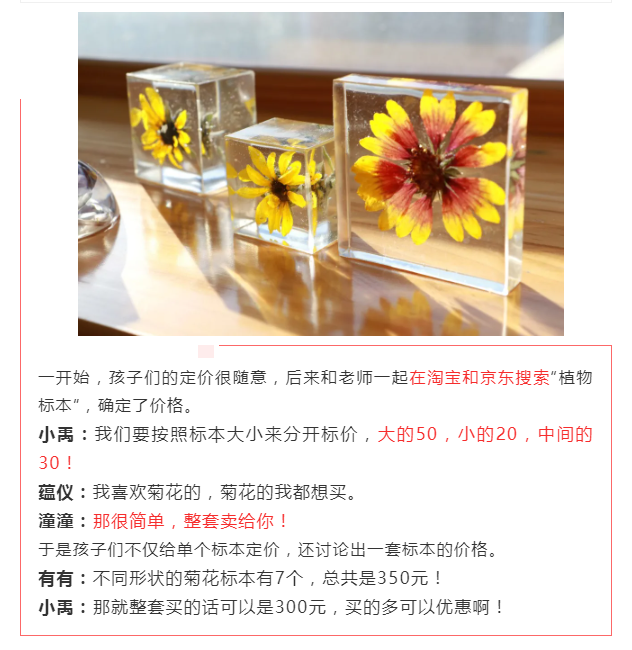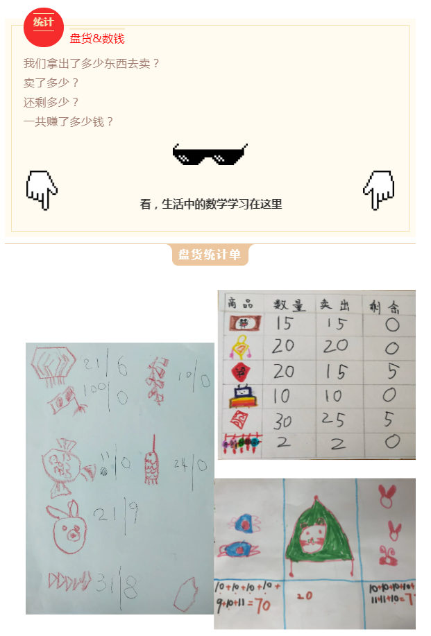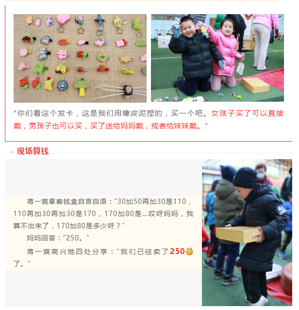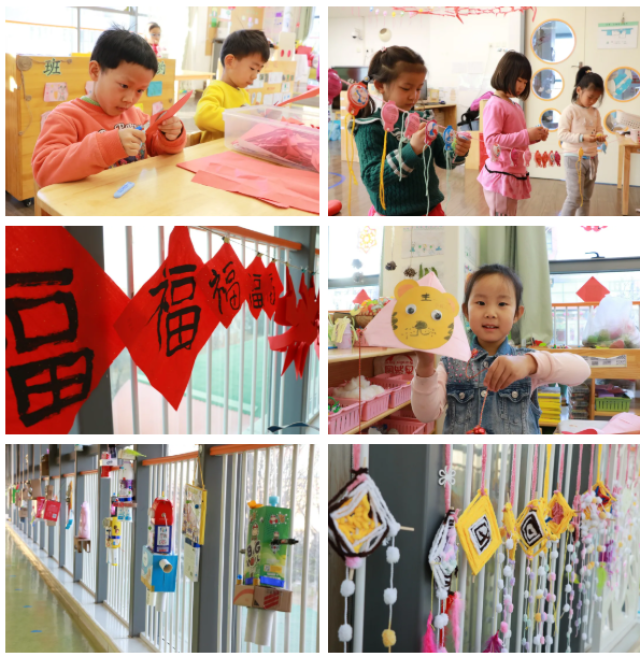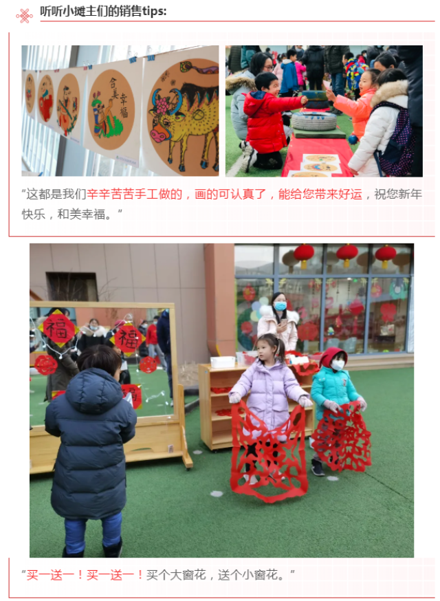 开始备货啦!剪窗花、绘年画、编拉花、折虎帽、粘鞭炮、写福字、烤陶土、制年历、做标本……整个12月,孩子们忙忙碌碌,准备赶集要卖的货物,还提前做过调查,每个班准备的都不一样哦。