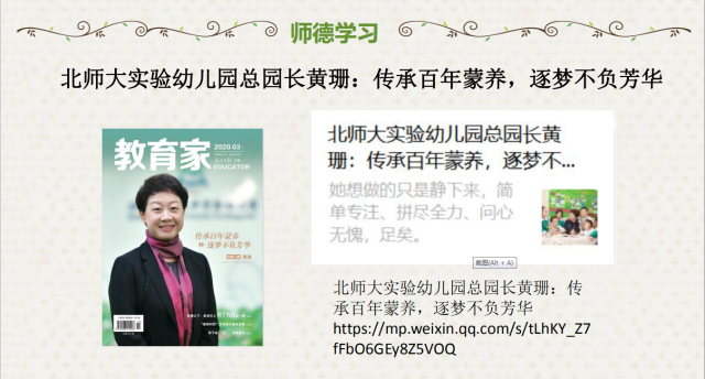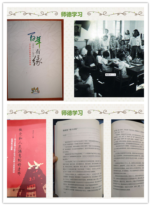 老师们通过阅读学习《教育家》期刊、《百年有缘》《做党和人民满意的好老师》等书籍,感悟优秀老教师高尚的师德情操。他们的事迹平凡之中见伟大,简朴之中见激情,生动而深刻的师德教育蕴含在一段段让人传颂的故事中。老教师向滚球app诠释“学为人师,行为世范”的教师准则。他们激励着新校区园的教职工们领悟榜样精神,提高师德修养,坚定理想信念!