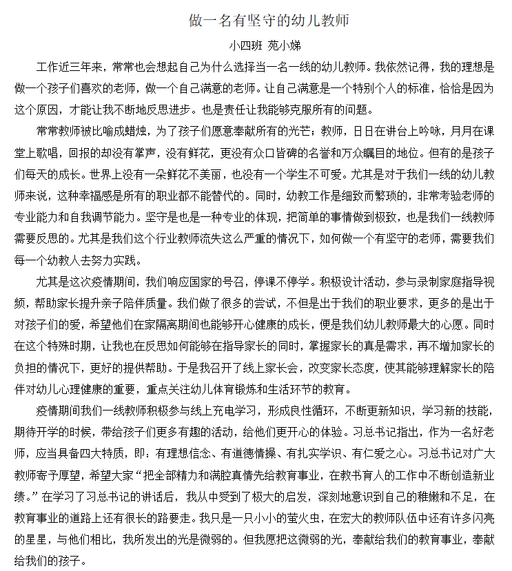疫情期间,老师们学习抗疫先进事迹,将这些人间大爱用演讲、征文、绘画等方式汇聚成对幼儿的关爱,对工作的热爱,对新时代青年教师锐意进取的赞美与讴歌。表达爱的方式有千万种,老师们的演讲真挚感人,一个个抗疫中的小故事,最是扣人心弦。