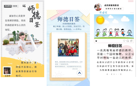 疫情期间,教师们通过师德日签勉励自己不忘幼师初心。每天教师轮流在幼儿园微信群中发布自己的师德日签。日签不仅包含激励教师成长的名师名言,还包含着教师们对它的理解与感悟,为幼儿园营造了“感恩奋进,为爱前行”的温暖氛围。