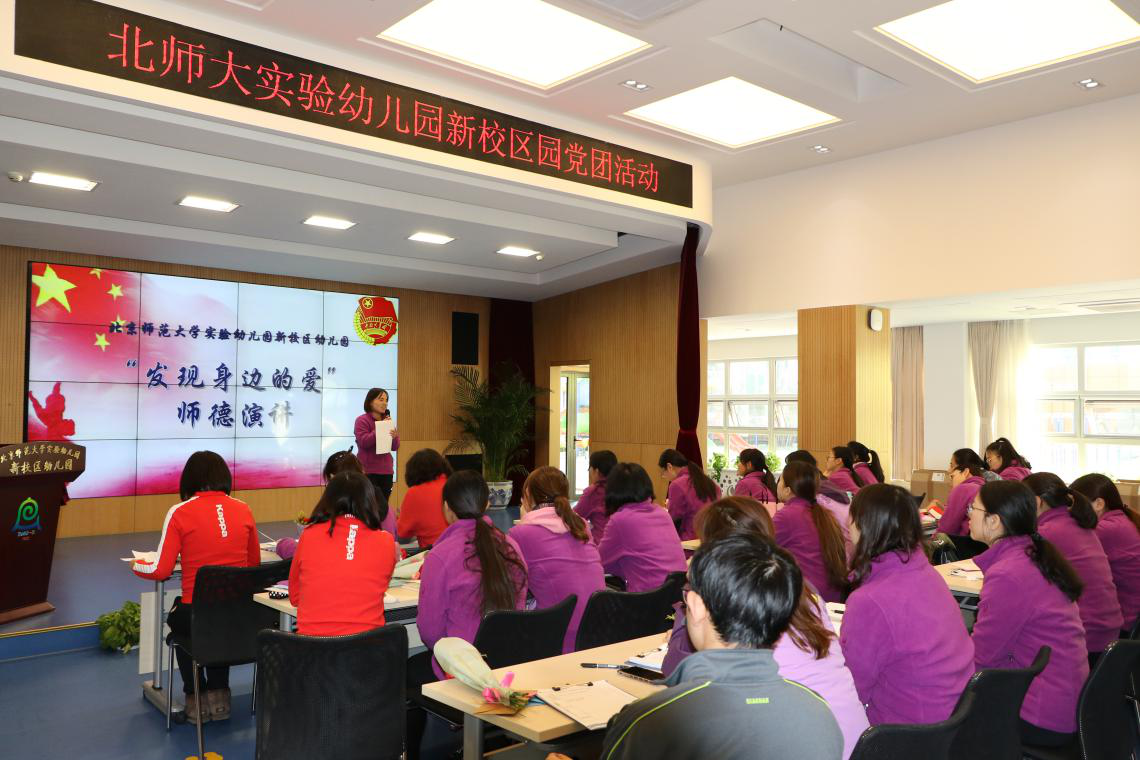 2017年11月21日,为了引导教师学会观察幼儿、理解幼儿,践行“以儿童为本”的教育理念,基于教育实践深刻理解和认识幼儿教师专业道德素养。新校区园组织教师开展“发现身边的爱”党团师德主题活动。活动之前面向全体教师以“发现身边的爱”为主题征文,请教师结合身边的例子,分享教师对待孩子的耐心、爱心如何在一日生活之中体现。活动中三名教师分别代表新教师、新班长、老教师演讲并分享感受,随后保教主任韩丹结合自身工作经验做了《没有问题幼儿,只有幼儿的问题》主题发言。最后,孙秀莲园长勉励全体教师观察幼儿、发现幼儿,做幼儿心目中的好老师,借助幼儿园搭建的平台多交流、多学习,共同为孩子的成长而不懈努力。