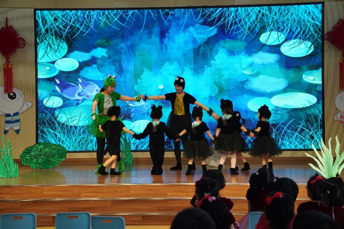 小三班的老师们变成了故事里的动物妈妈,带着全体小朋友一起表演了有趣的故事《小蝌蚪找妈妈》。