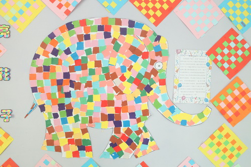 《花格子大象艾玛》——小三班用撕纸方式合作完成的“花格子大象”