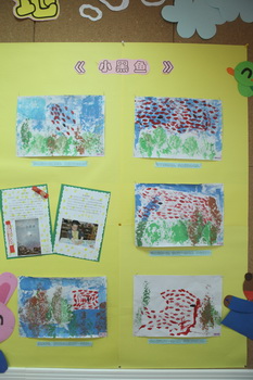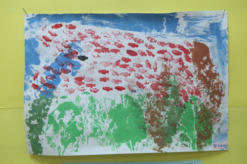 《小黑鱼》——中三班小朋友用橡皮印章再现小红鱼和小黑鱼变大鱼的场景