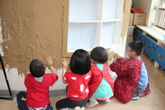 为了发挥幼儿在环境创设中的主体作用,每一次的大厅环境创设中滚球app都鼓励幼儿一起参与,把幼儿在创设环境过程中遇到的问题当做是提升幼儿解决问题能力的“良机”。如在这次创设“山顶洞”环境中,滚球app和孩子一起将泥巴糊在了光滑的墙面上,结果第二天泥巴全部脱落了。看着一天的辛苦付之东流,孩子们都互相打气“别灰心,加油!”经过讨论,第二次滚球app在泥巴里加入了乳胶,可泥巴还是一如既往地掉;第三次滚球app一起询问了幼儿园的维修师傅李老师,李老师给滚球app讲解和演示了泥巴掉的原因,并建议滚球app将泥巴糊在草席上,将草席挂在墙面上。经过努力最后滚球app终于成功了!第二天一大早看着终于上墙了的泥巴,孩子们都特别地激动!