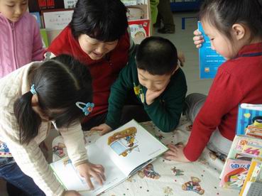 3、老师的手拉着孩子的手:各班开展有特色的语言活动,如娃娃图书馆,温馨图书区,形式多样的语言教育活动等。