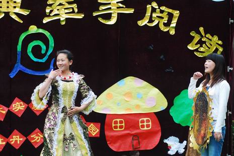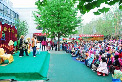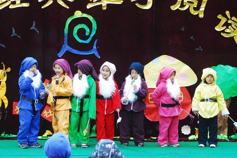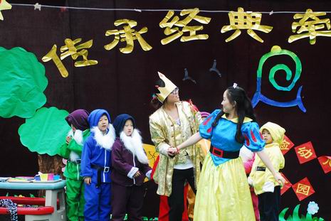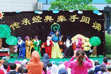 在开幕式上,教师和孩子们一起精心编排了多个经典童话剧和经典故事,如《白雪公主》、《皇帝的新装》、《小兔乖乖》等。在故事表演的过程中,老师们还惟妙惟肖地讲述了《两只笨狗熊》、《老虎拔牙》、《我想养只宠物》、《爱生气的小熊》、《小象要回家》、《穿西装的吹气猪》等经典传统故事。夸张的造型、生动的表演、抑扬顿挫地讲述,让孩子们笑声不断、掌声连连。在开幕式中,孙园长还即兴给孩子们讲述了民间故事《母象与小象》,幽默风趣的语言、扣人心弦的故事情节,深深地吸引了全场的听众们,博得了热烈的掌声。