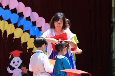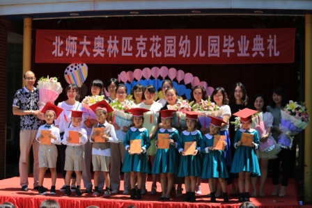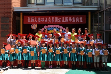 最激动人心的时刻是授礼仪式,园长、主任亲自给每一个孩子颁发毕业证书、授博士帽,孩子们神情庄严,迎接着人生的第一次毕业。