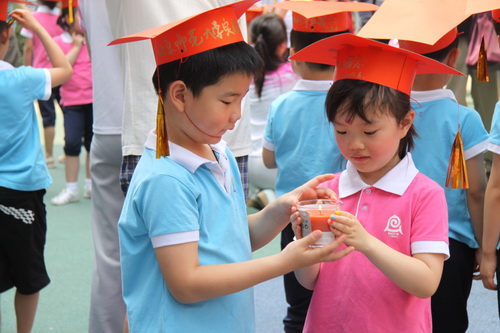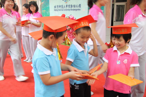 园长和老师们亲手为孩子们戴上博士帽、颁发毕业证书