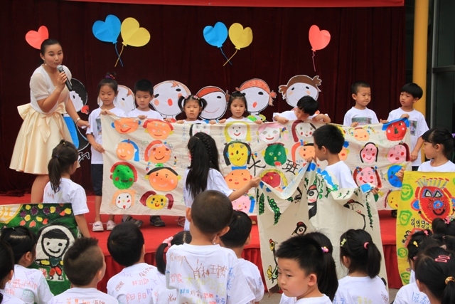 大班小朋友将集体画作作为礼物赠送给幼儿园