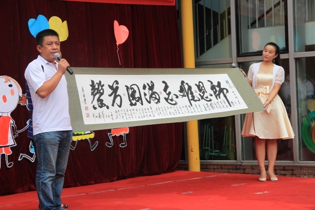家长代表给幼儿园和教师们赠送珍贵的礼物——书法作品《师恩难忘》