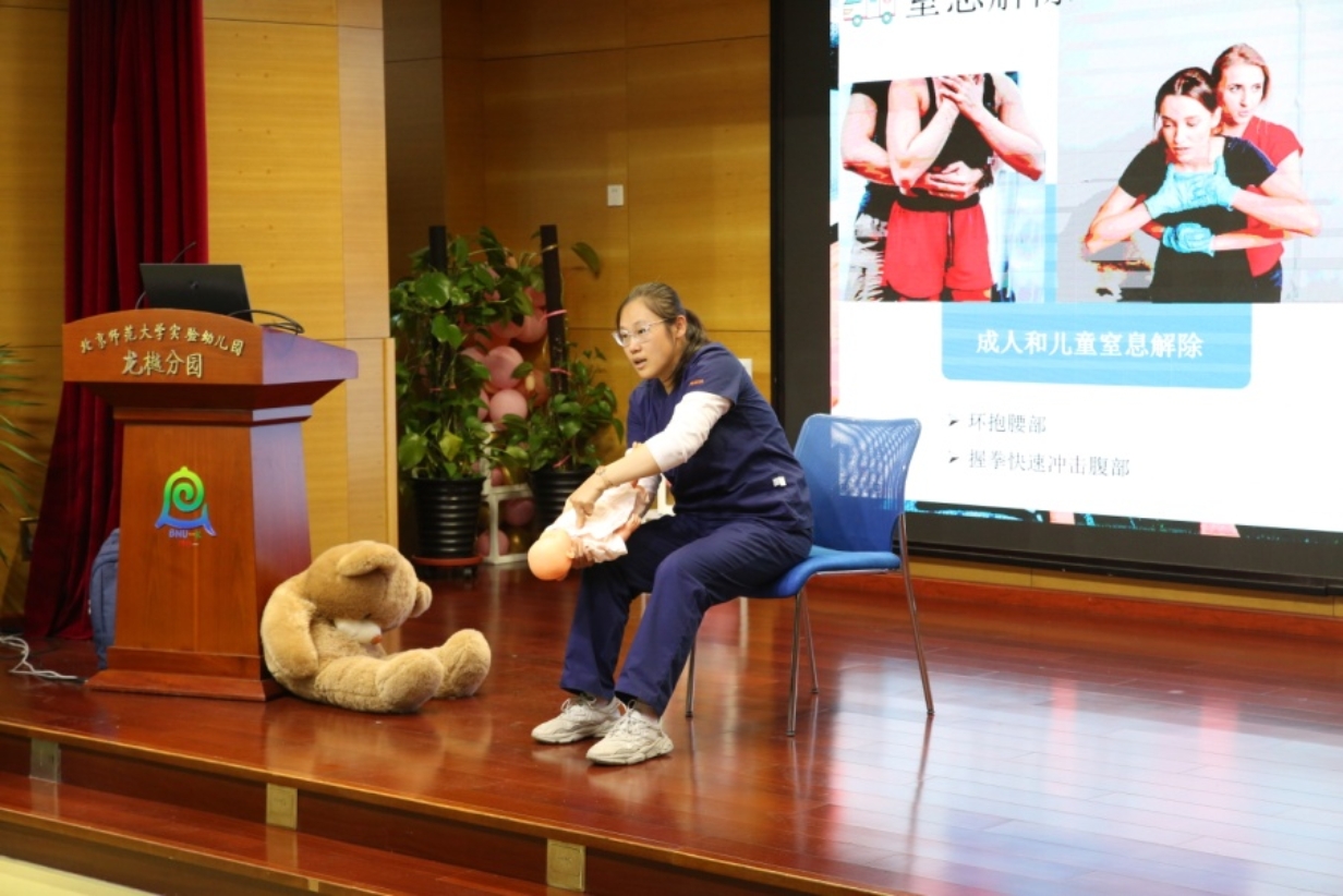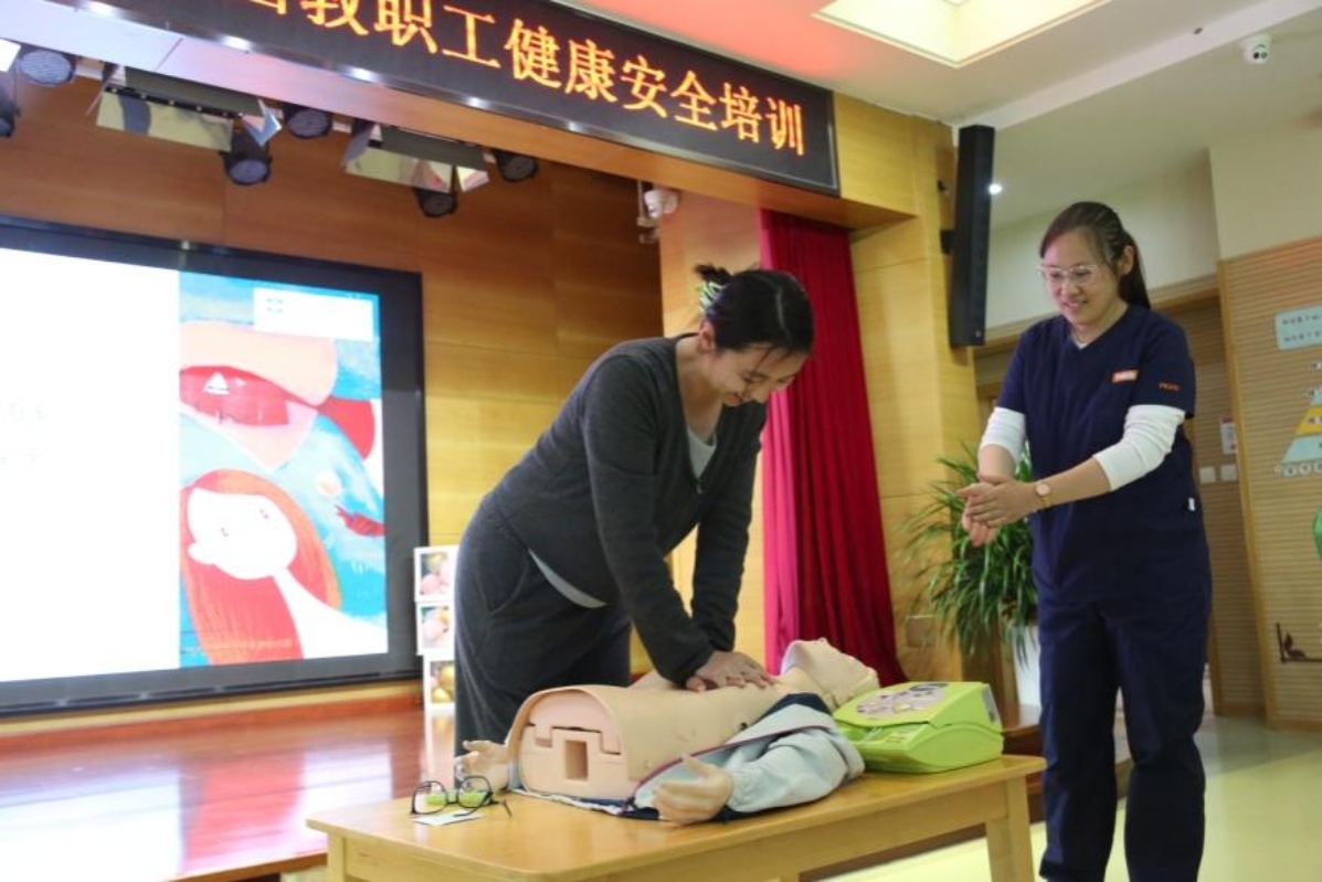 为全面提升教职工应对突发事件的处置能力,切实保障在园师幼的生命安全,2025年4月24日,我园特邀北大国际医院重症医学科孙薇医生为全体教职工开展了一场生动实用的急救知识技能专题培训,旨在通过急救知识学习和实操演练,帮助教师掌握心肺复苏、海姆立克急救法、高热惊厥发作急救的关键技能。