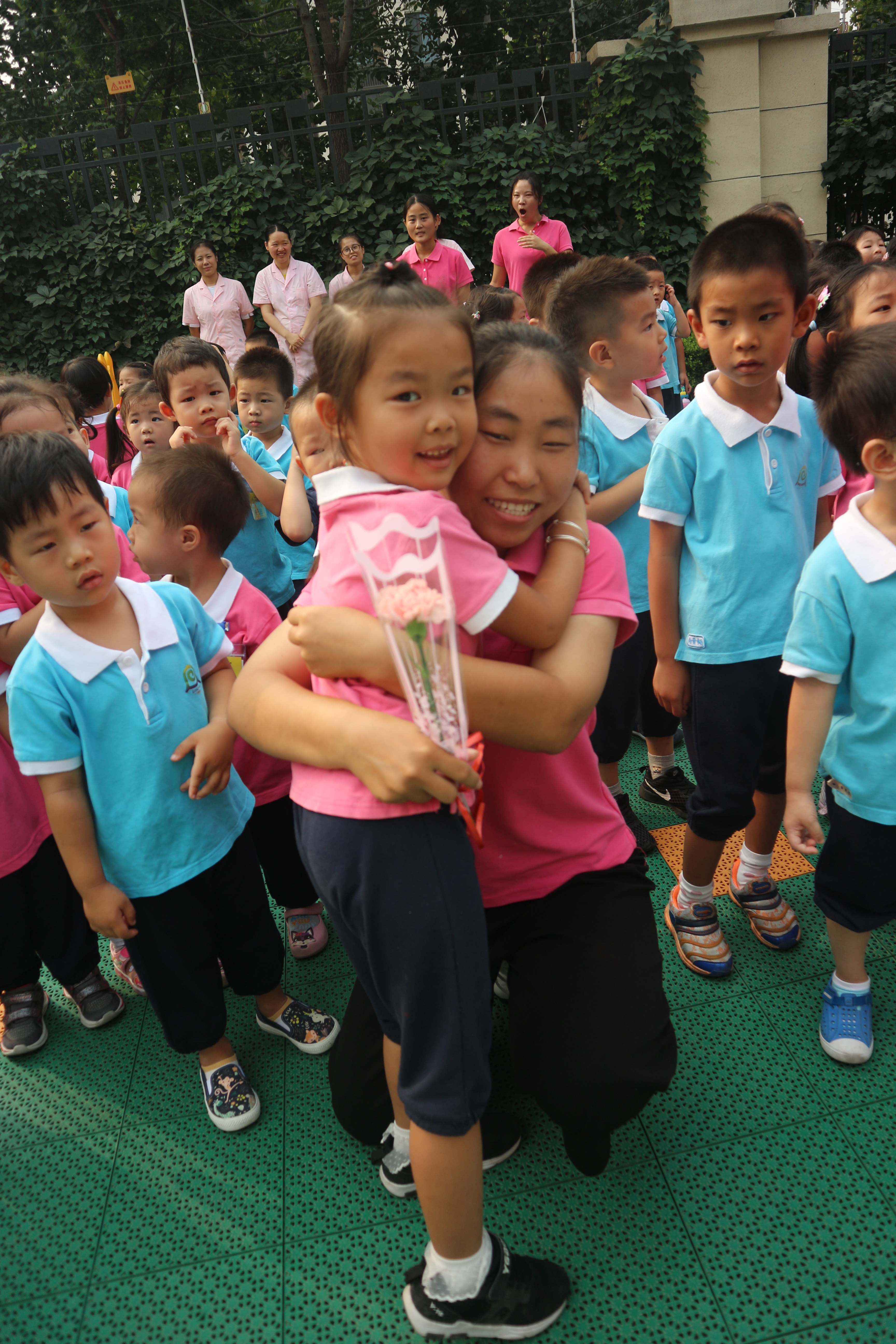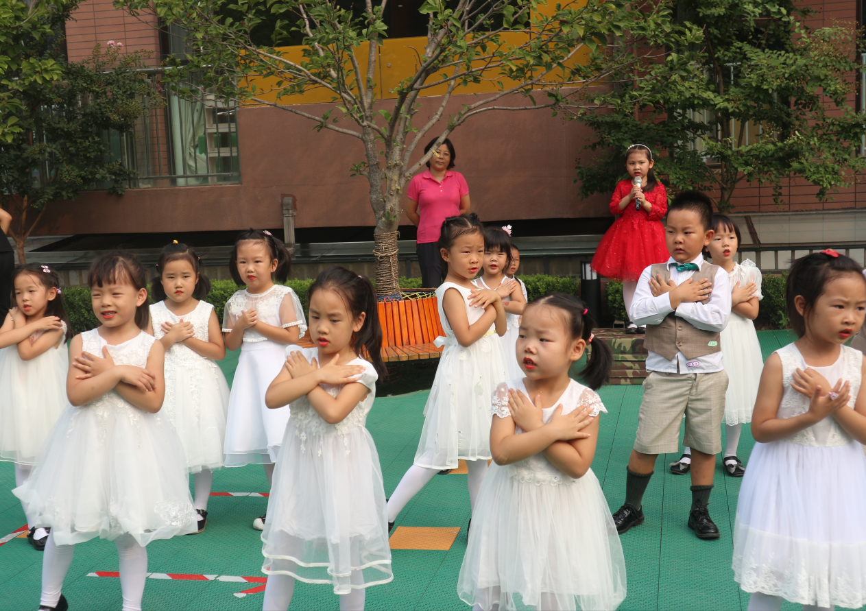 大班幼儿在升旗仪式上用鲜花和歌舞表达对老师的感恩之情