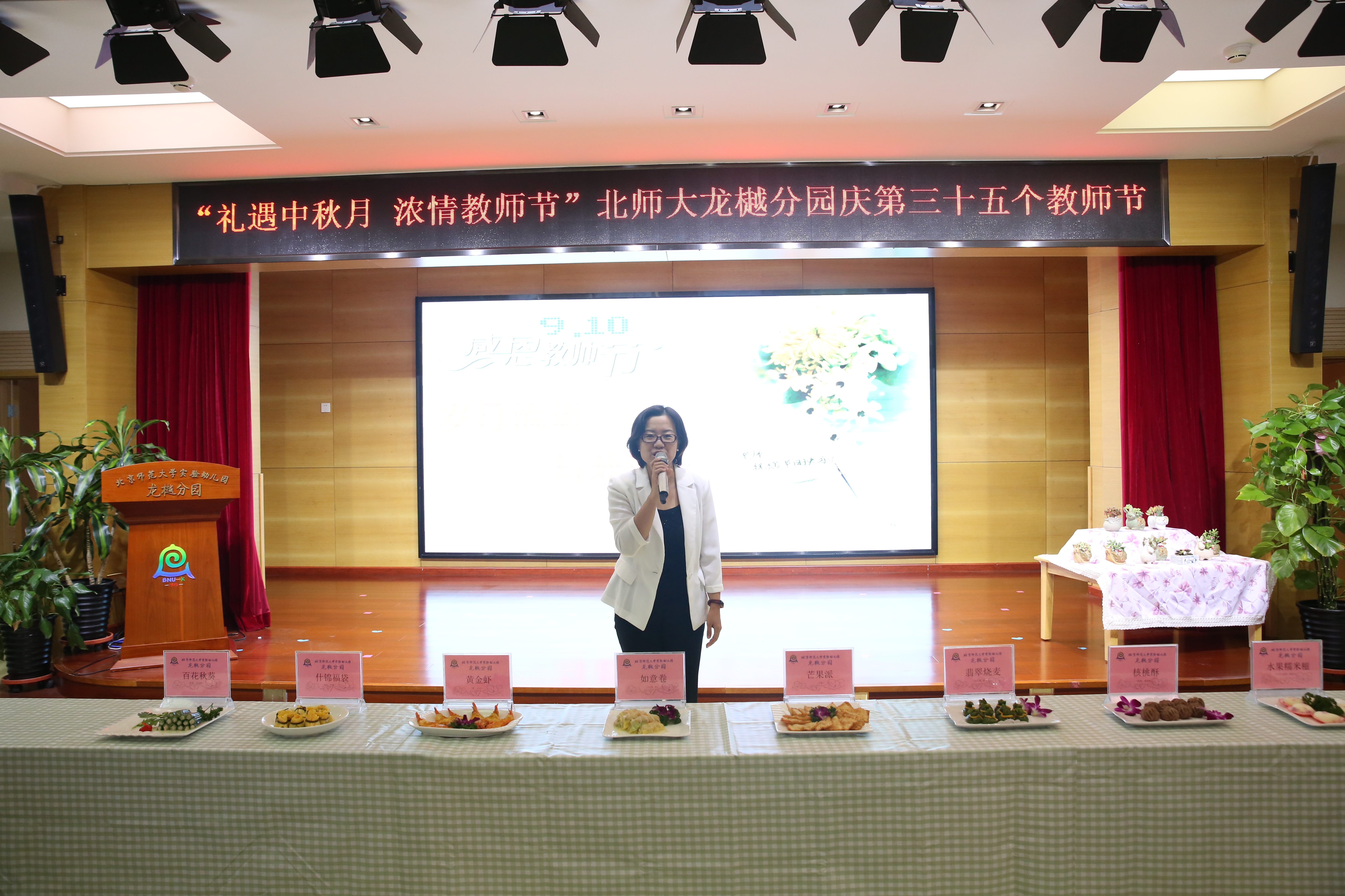 2019年9月9日与10日,龙樾分园全体师生共同迎来第三十五个教师节。在周一的升旗仪式上,大班小朋友通过献花、歌舞演绎的方式表达了对老师们节日的祝福与感恩。10日晚间,全体教职工欢聚一堂,品厨艺作品,看教师才艺,听“我与师大的故事”,拜“德艺双馨”的师父,共同度过了一场意义难忘又收获满满的教师节!