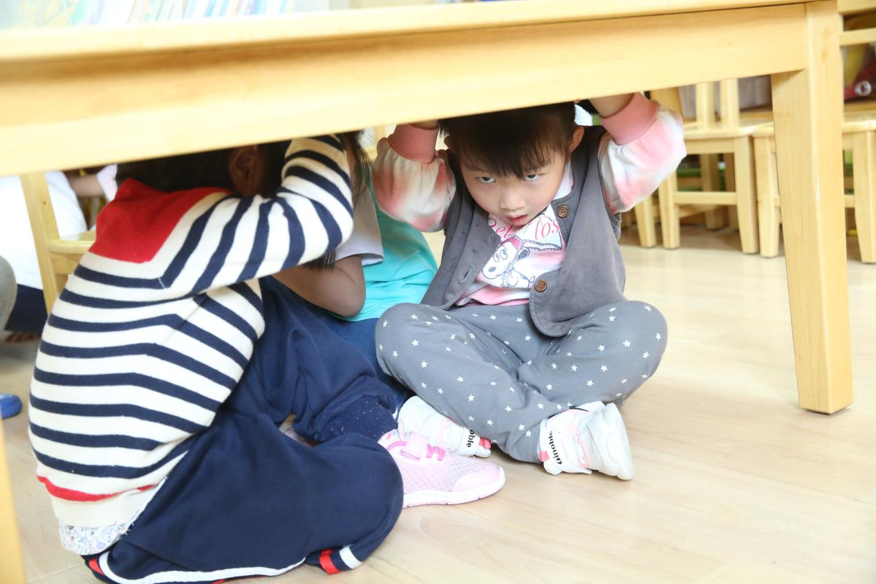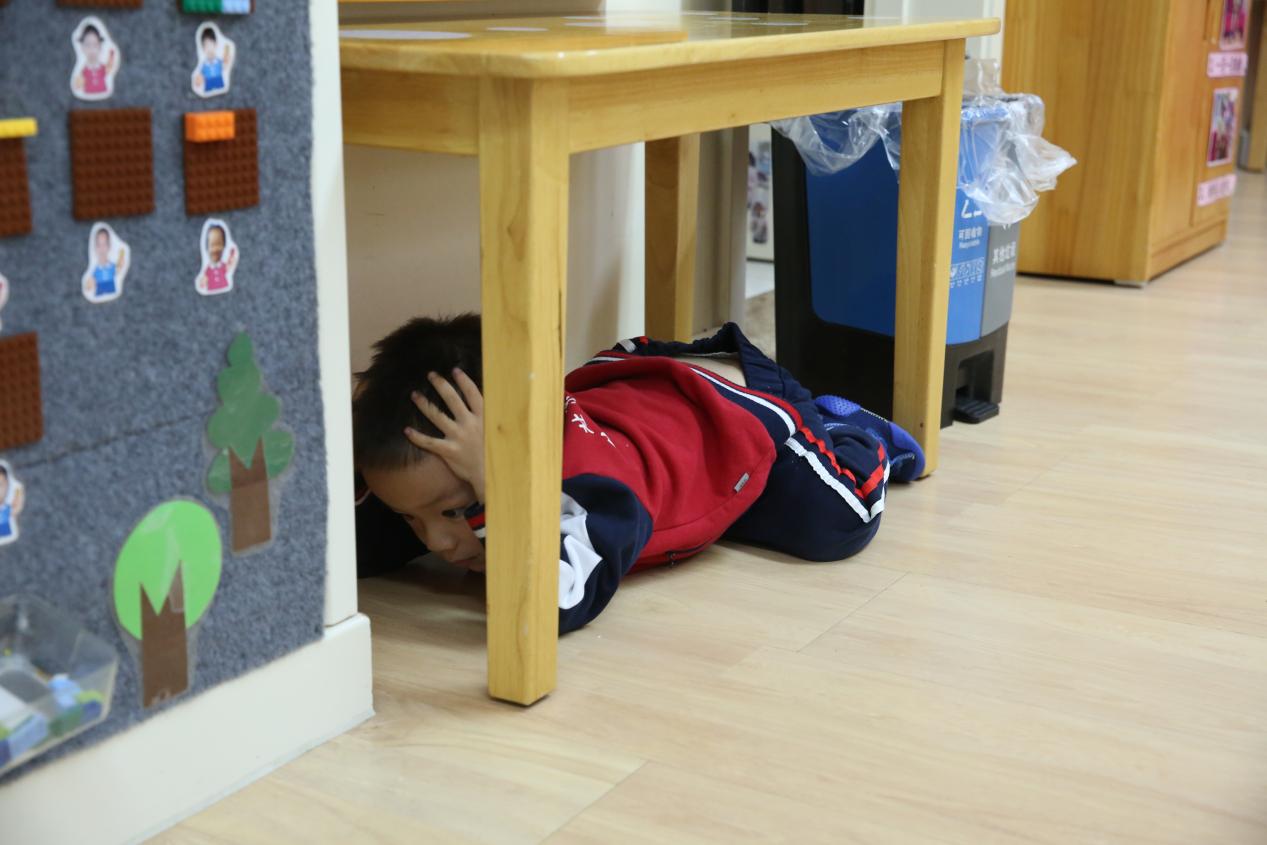 5月12日,警铃响起,防震逃生演习活动正式开始。班级教师快速指导幼儿快速躲到桌子下、墙角处,当发出撤离指令时,幼儿双手抱头紧随教师撤离到安全场地。