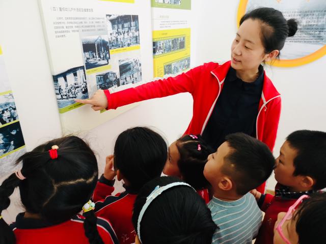 老师们带领小朋友参观园史墙,了解幼儿园的过去与现在