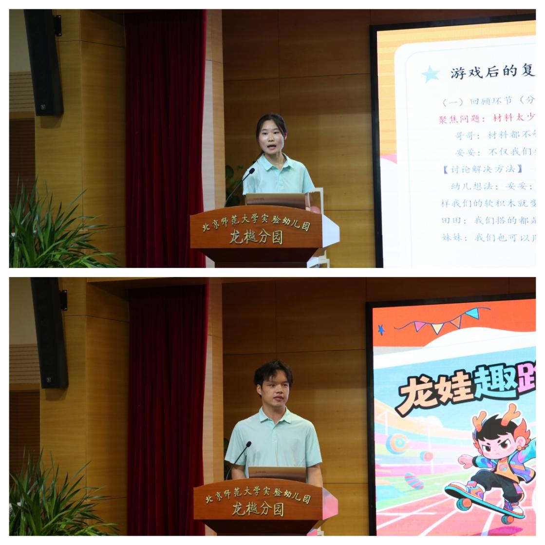 随后袁鹏、姜思琦两位教师结合自己班级真实的游戏场景进行了游戏案例《龙娃趣跑酷》和《房子变游乐场》的游戏案例分享,引发了跟岗教师关于 “游戏与发展”的深度思考。