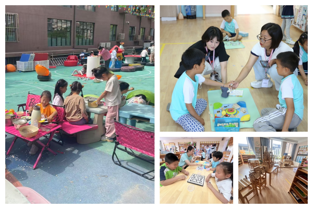 随后跟岗教师进到班级进行室内外自主游戏和环境创设的观摩,从低结构材料投放到幼儿个性化游戏表征,从游戏前的小组计划到游戏后的思维共创,教师们亲临现场的感受了幼儿在开放的环境中主动协商、合作解决问题、拓展游戏内容。