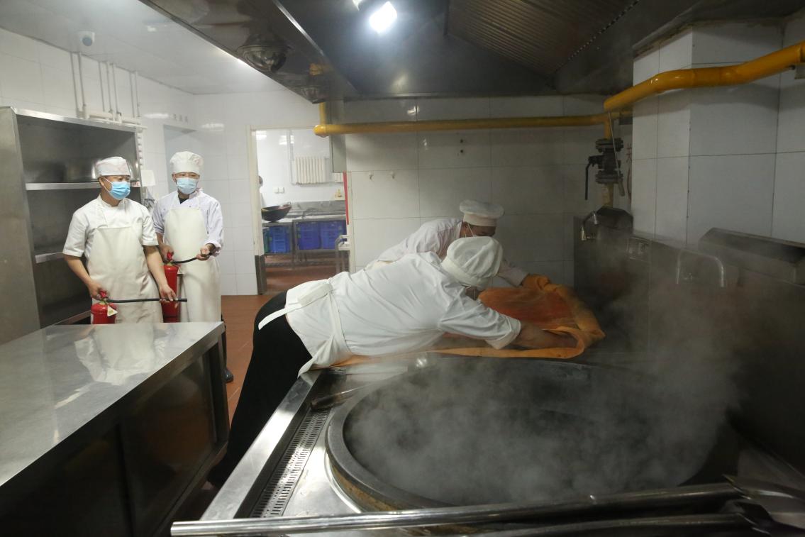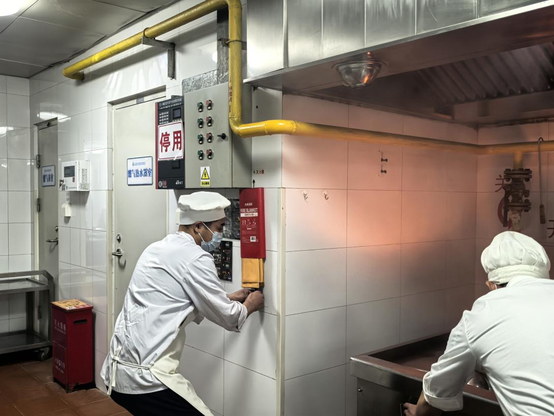 下午,厨房进行了专项火情消防演习,模拟场景中,厨房工作人员发现“火情”后,立即启动应急预案,各组人员反应迅速,分工明确,一组人员能够迅速取出灭火毯覆盖火源,防止危险扩大;另一组人员迅速切断厨房总电源与燃气阀门,并第一时间拨打园内应急电话上报情况,其余人员能够迅速持灭火器增援,控制火情,整个演练过程厨房工作人员能够按照处置流程规范操作,高效完成了火情控制,充分检验了厨房工作人员的消防应急能力。