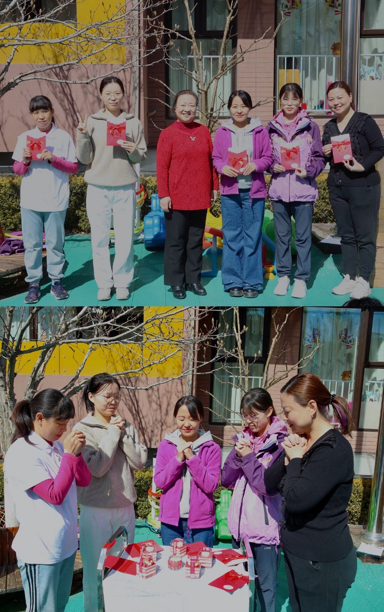 3月8日中午,老师们相聚前操场。一首温馨的“生日快乐歌”拉开了活动的序幕。高园长和各班组老师们为3月份过生日的五位寿星送上特别的生日祝福,围着香甜的生日蛋糕和温情的烛火,老师们许下新一岁的美好愿望。