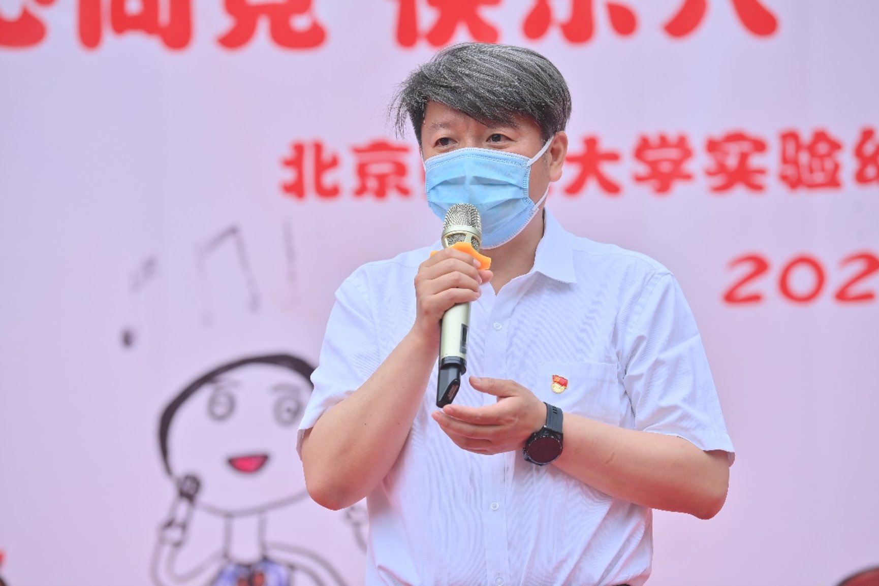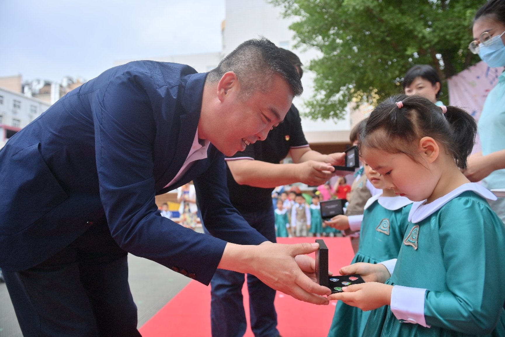 海淀区城市管理委主任赵寒、花园路街道党工委书记高毅为幼儿颁发环保奖章