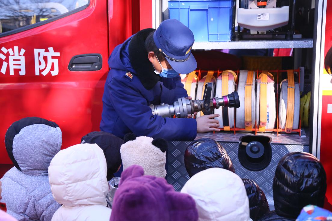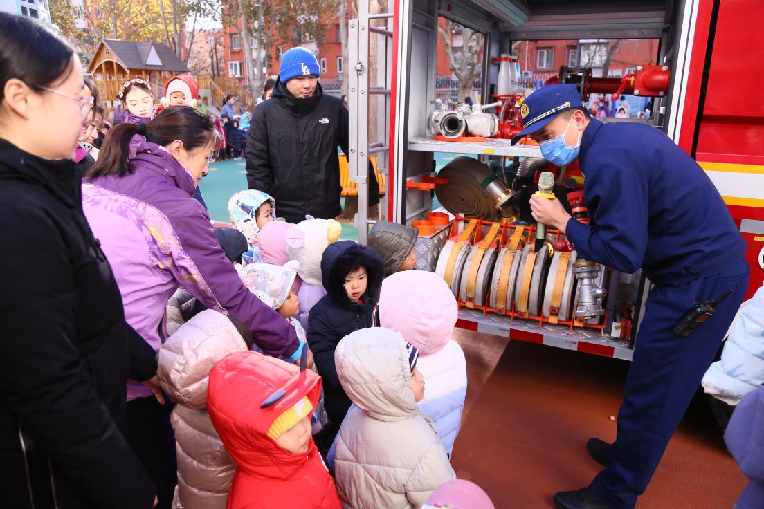 在紧张的逃生演练过后,双榆树消防中队的消防员叔叔开着消防车进入幼儿园,生动有趣的向小朋友们介绍消防装备的使用方法及用途,小朋友们用眼看、用手摸,消防叔叔亲切的与小朋友们互动,回答他们提出的问题,在寓教于乐中达到消防教育宣传的效果。