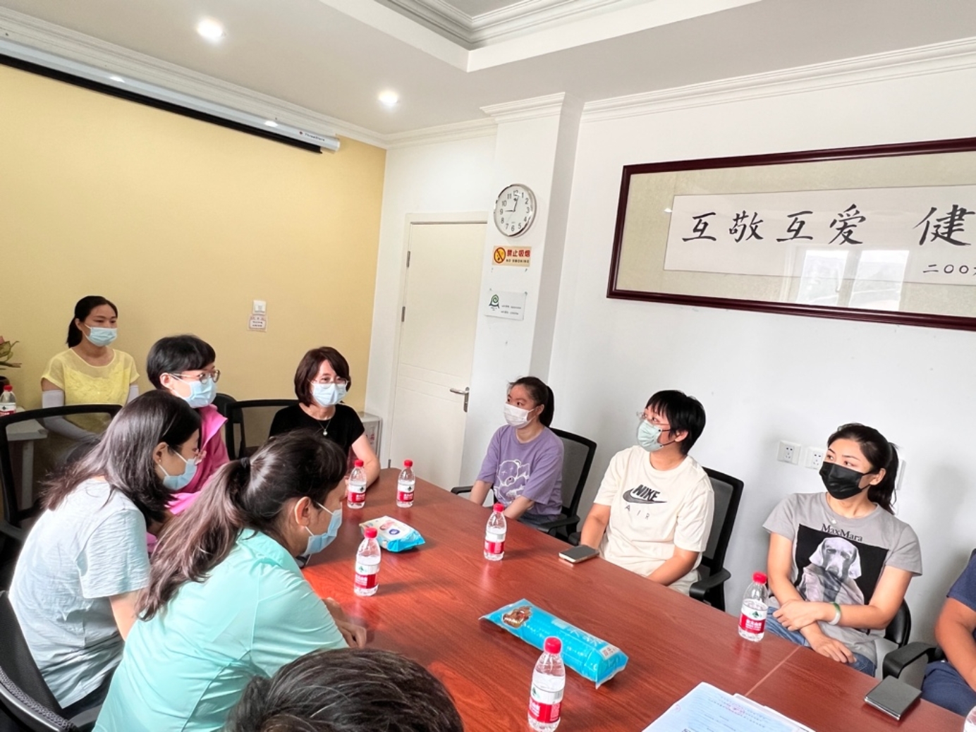 2022年8月13日上午,牡丹分园召开了暑期工程家园交流会。参与此次会议的有北京师范大学基建处技术顾问何代晟、工程监理经理、施工方项目经理、中国国检集团项目材料检测取样技术团队、以及幼儿园各年级家长代表,共20名人员。