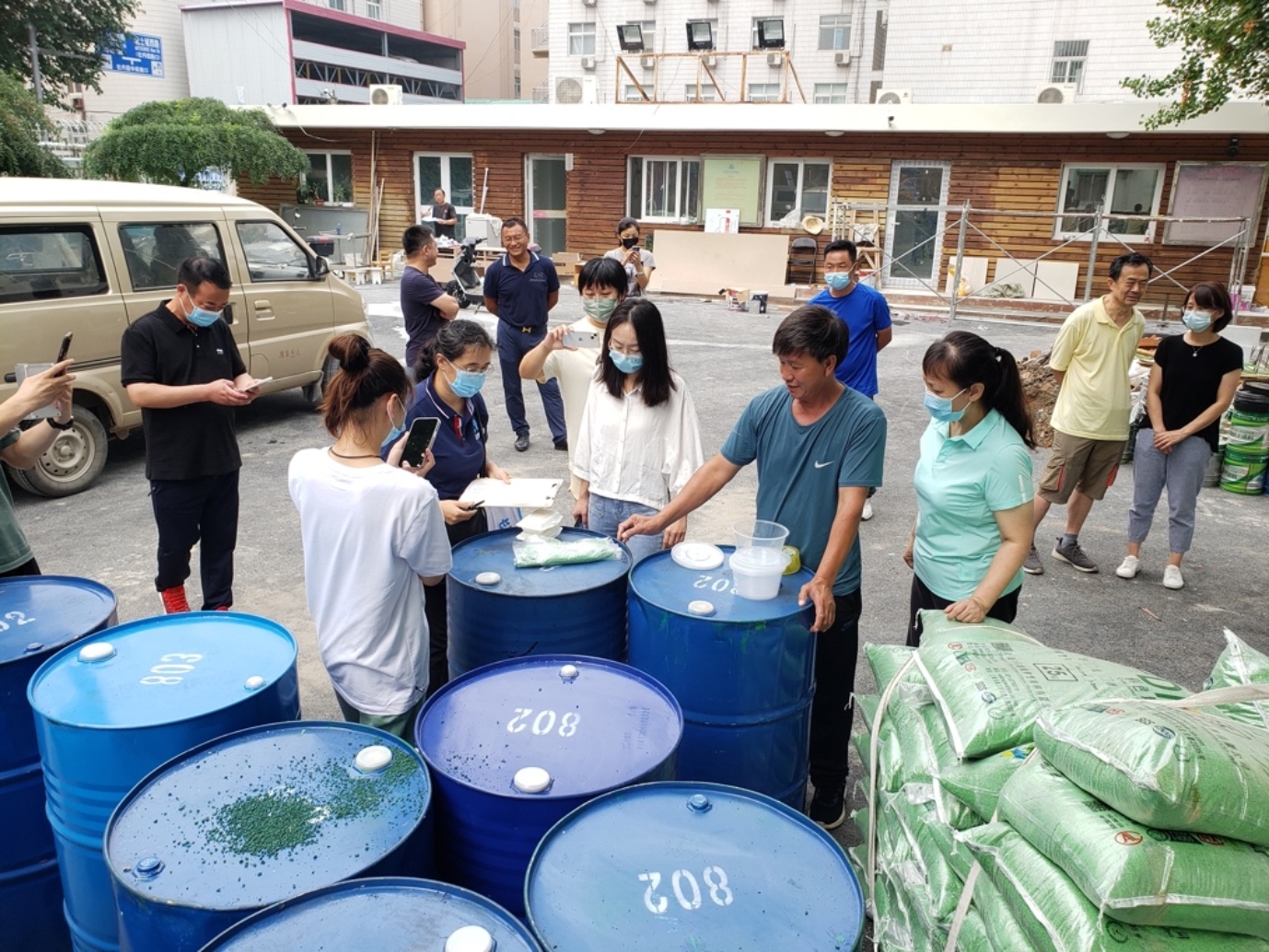 最后大家一起来到室外,中国国检集团的检测工作人员对户外场地所用的主材和辅料都进行了现场抽检采样、封样。