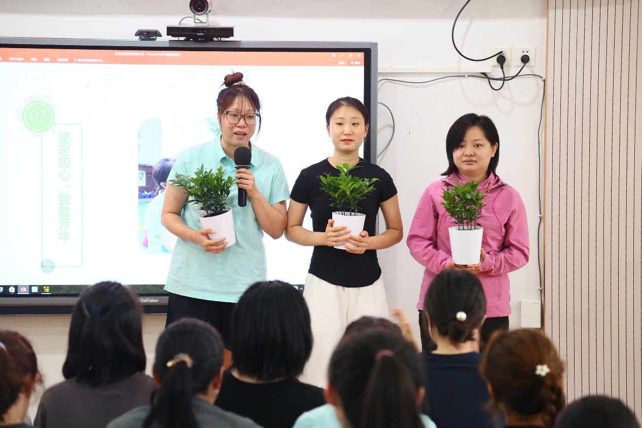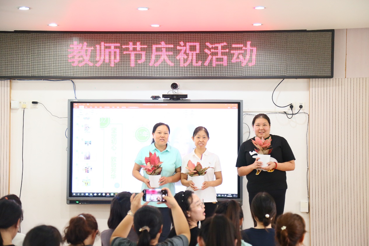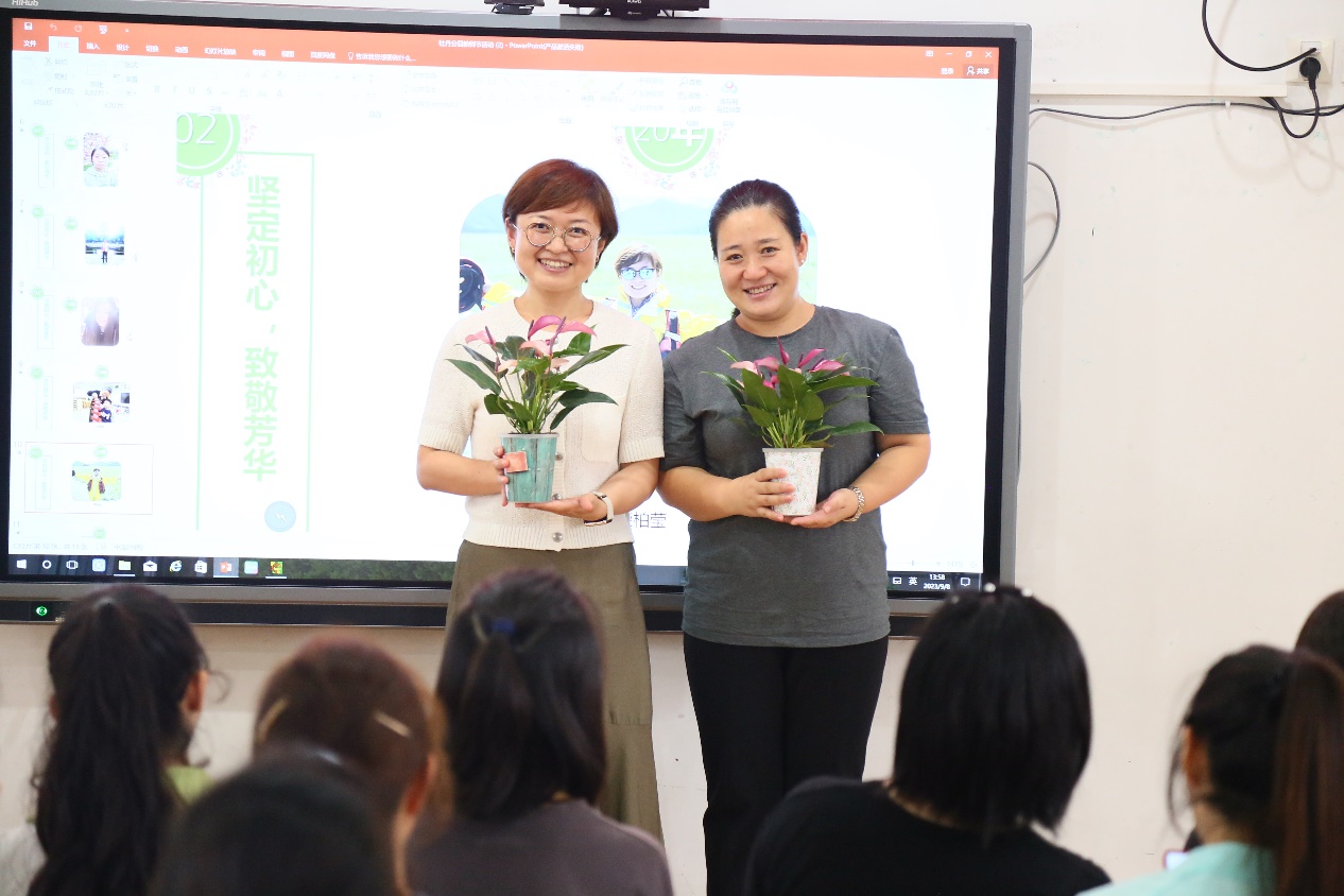 保教主任赵庆楠主持教职工表彰活动,为在园工作10年、15年和20年的教职工进行表彰感谢。执行园长夏华颖、后勤主任付小宁和资深教师何莉莉分别为老师们送上祝福,感谢大家一直以来对幼教事业的坚守与奉献。勉励年轻教师树立职业信仰,脚踏实地,以赤诚之心、奉献之心、仁爱之心投身教育事业。